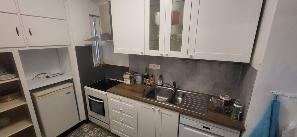 L’ensemble fait 18m². La cuisine comprend frigo, four, taque électrique, lave-vaisselle, évier et vaisselle en suffisance.