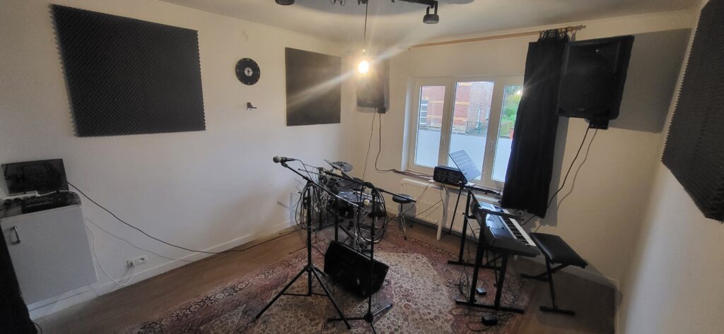 Pièce de 15 m² traitée acoustiquement. Dispose d’une petite table de mixage, d’une façade (2 enceintes 15″), d’une batterie électronique, d’un piano électrique et de micros.